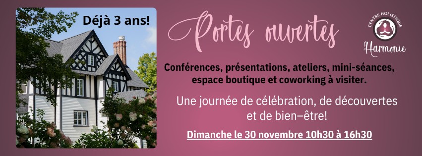 Différents ateliers d’échange, de partage, de formation et des retraites spirituelles sont maintenant proposés à la clinique. Vous pourrez également visiter ma page Facebook professionnelle Centre holistique Harmonie pour connaître tous les évènements offerts en collaboration avec les partenaires.